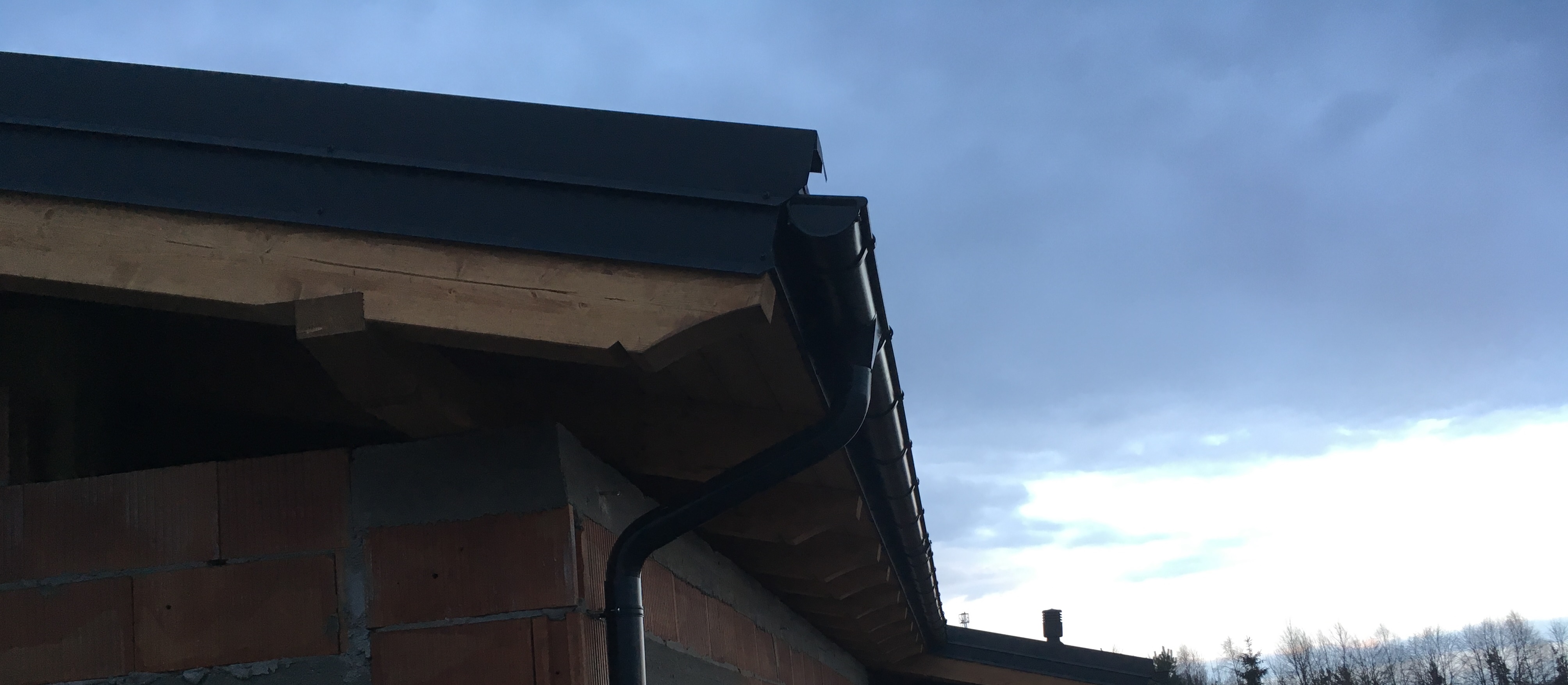 Detal wykonania szczytu budynku. Widać więźbę wykonaną na obrabiarce CNC i metalowe rynny. Ozdobna więźba z drewna klejonego warstwowo.